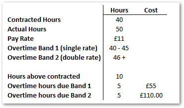 This employee is contracted to 40 hours per week, but has worked 50. According to their contract, any hours worked between 40 and 45 per week are paid at a single rate, but any over 45 are paid at double rate.
