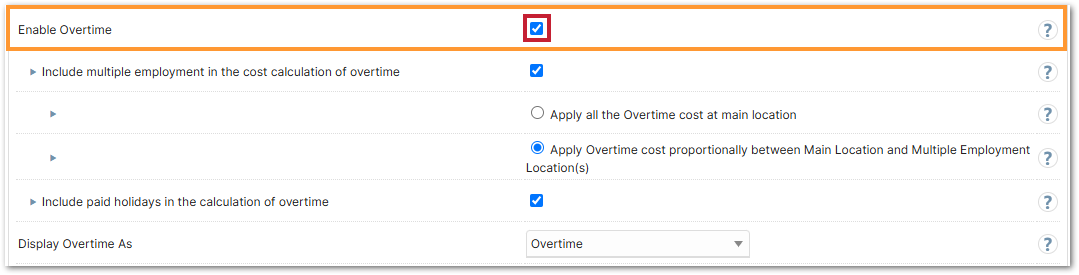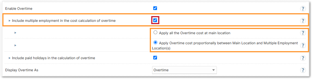 - To associate overtime costs, in the wage cost, to the actual location the employee worked, select Apply Overtime Cost Proportionally between Main Location and Multiple Employment Location(s)