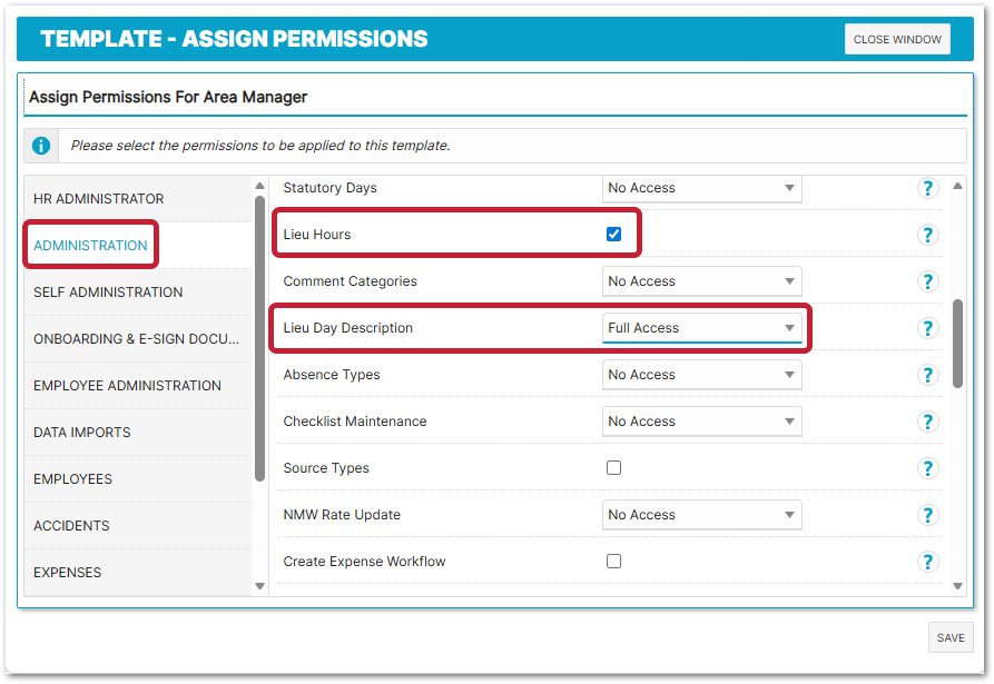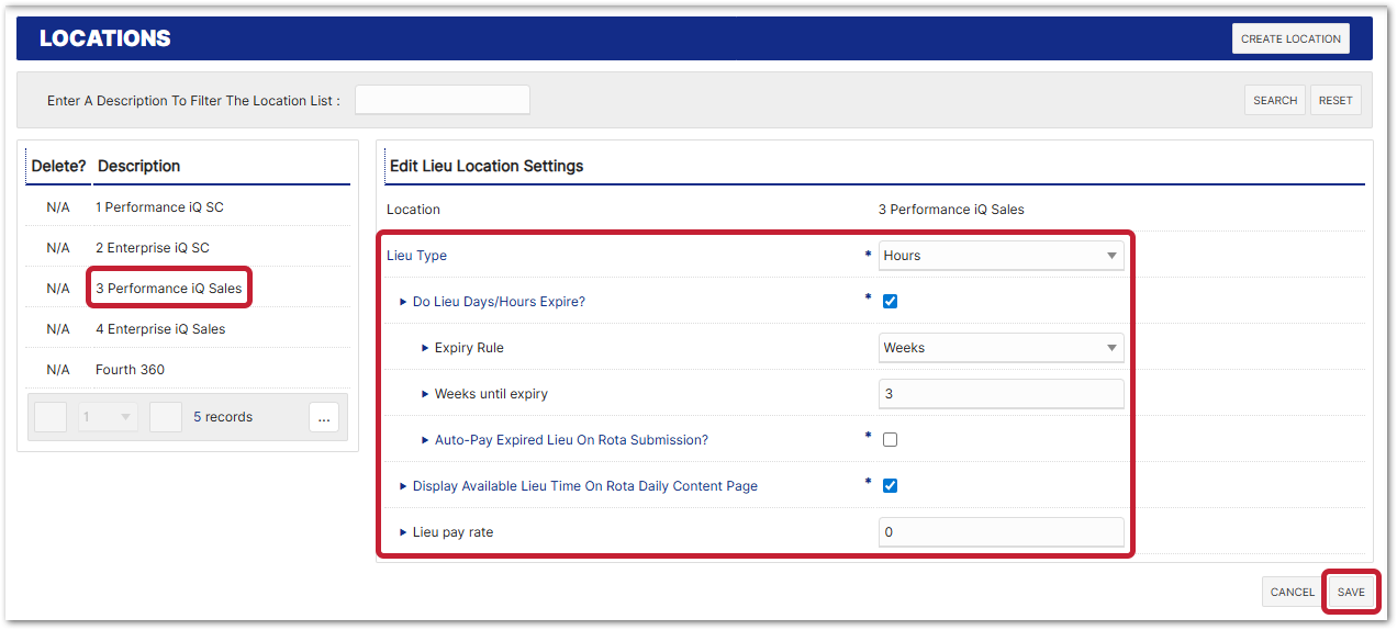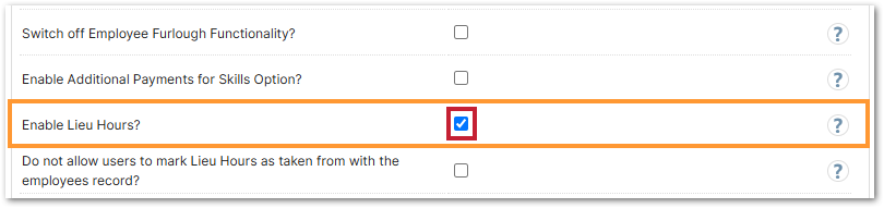 - Locate and tick the Enable Lieu Hours? box, and then Save (bottom right corner)