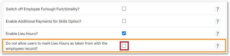 - Locate the Do not allow users to mark Lieu Hours as taken from with the employees record? setting and enable if required: