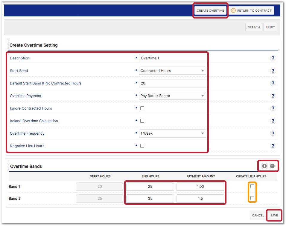 - To set the band to create lieu hours, rather than overtime, select the checkbox labelled Create Lieu Hours