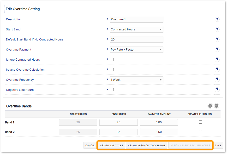 - If an employee does not have any Contracted Hours, enter the number of hours in the Default Start Band if No Contracted Hours that the overtime will start from