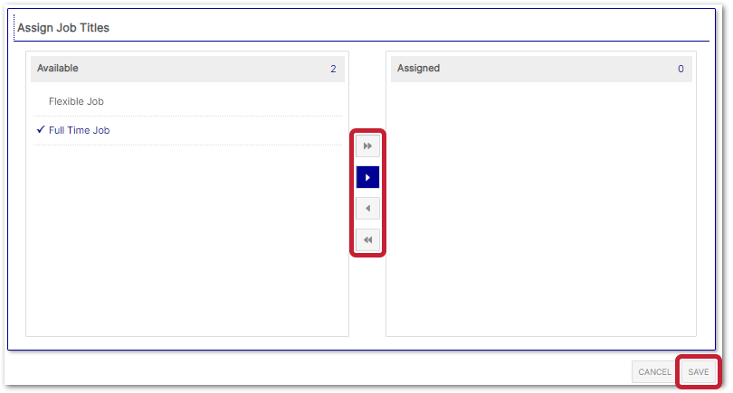 - Select the applicable Job Titles from the Available section of the selection box, and using the arrows, move the selected Job titles to the Assigned section > Save