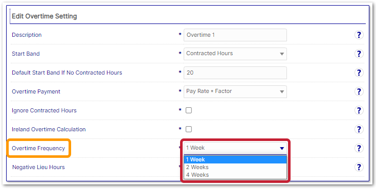 - Overtime Frequency - select if the overtime should be calculated over 1, 2 or 4 weeks. 2 or 4 weeks will result in overtime calculations being made on a fortnightly or four-weekly basis using a total of hours worked within the selected period