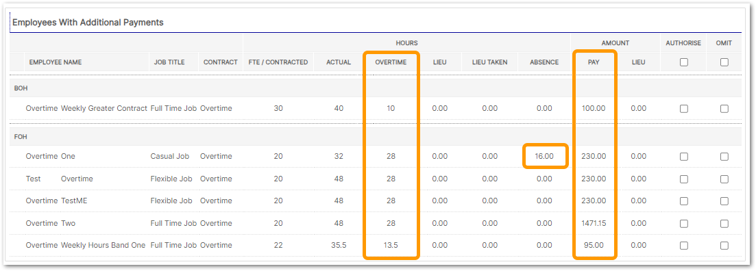- The Additional Payments Screen details the hours worked, contracted hours, overtime and/or lieu hours and cost per employee
