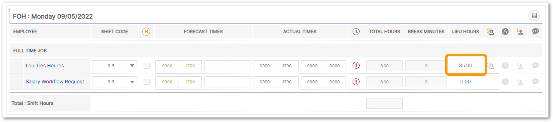 Alongside the employee's actual times, there are two columns associated with Lieu Hours