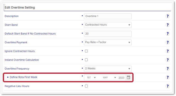 - Use the Start Band drop-down to select the point at which the overtime will start - either Contracted Hours or FTE.