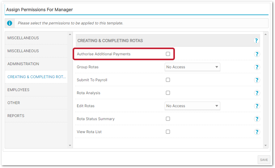 - Select the Template > Assign permissions > Creating and Completing Rotas > Authorise Additional Payments > Save