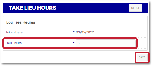 - Enter the number of Lieu Hours an employee wishes to take > select Save