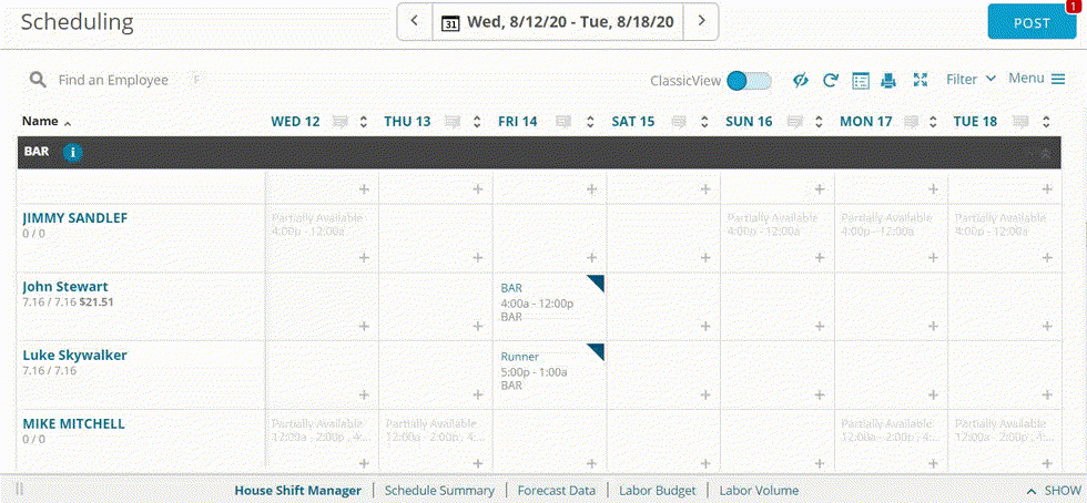 Please note: Schedules can be viewed, edited, and posted up to 15 weeks ahead. Shifts in the past cannot be created or edited. Edits are saved immediately and will be visible to any other manager viewing the schedule once each change is made to a shift.
