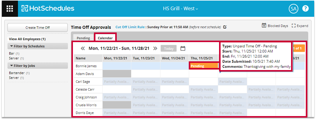 This article will cover how approving requests can be done through the Time Off Notification, Pending Sub-Tab, and Calendar Sub-Tab. Also covered is Approving Paid Time Off Inquiries.