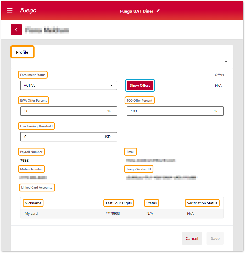 Linked Card Accounts - displays the employee's banking information once they link their card or bank account information through the Fuego app