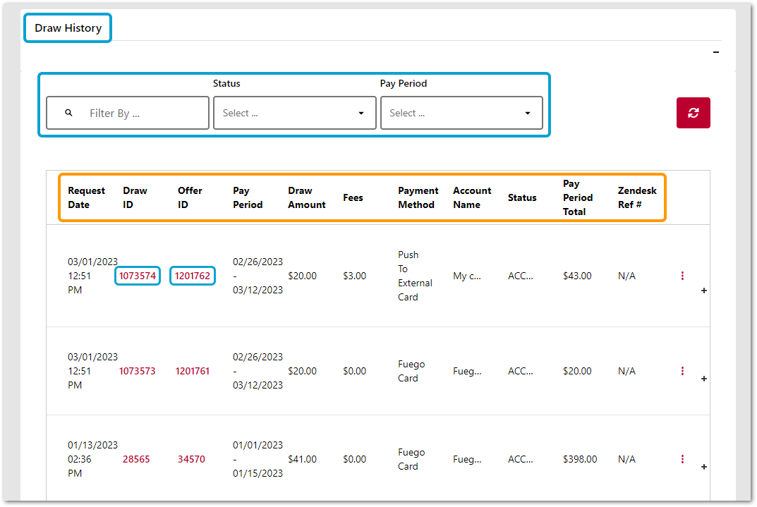 Draw ID - clickable link that provides the ID, Worker ID, Employment ID, Offer ID, Payment Method, and Request Date of the transaction