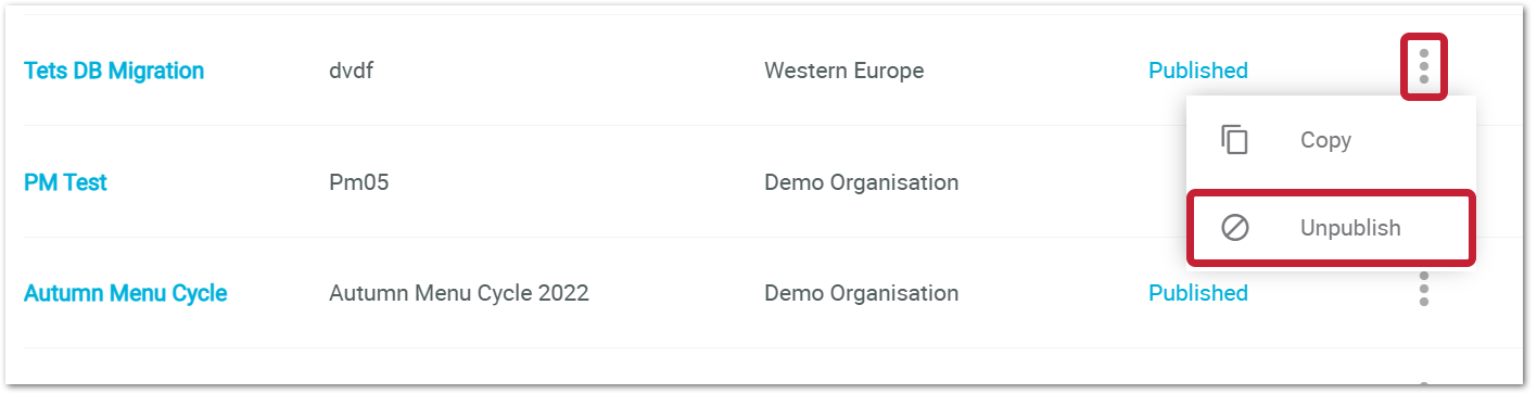 Fig.4 - Selecting 'Unpublish' for a specific menu cycle at a specific destination (location)
