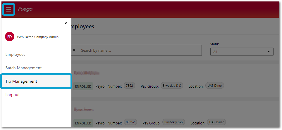 - Log in to Fuego, use the 'burger' side menu, and select Tip Management