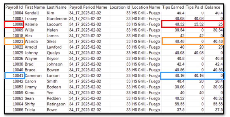 - Tips Paid - this shows all tips paid out to employee during the pay period. - Balance - calculates the difference between 'Tips Earned' and 'Tips Paid'. Importantly, the balance can show a negative value, indicating that there were edits to the original imported tips after a payout was made to the employee.