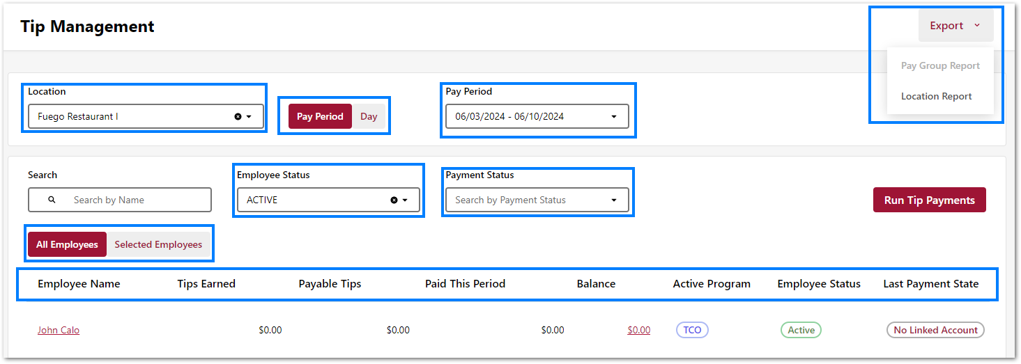 The Tip Report can be run at any point for an open or closed pay period, either by Location or Pay Group. Running the report mid-period will give you an overview of any tips paid out already and to whom.