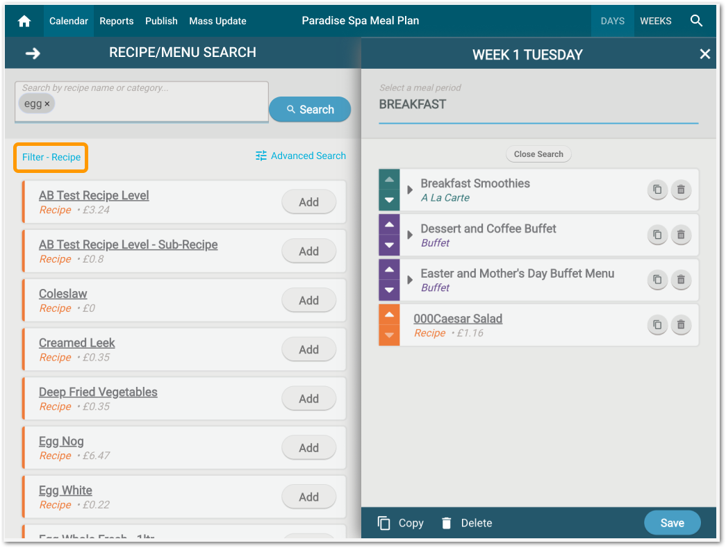 When editing a meal period and searching for items to add to the meal period, a filter will now be available on the search results screen - All (default), Recipes or Menus.