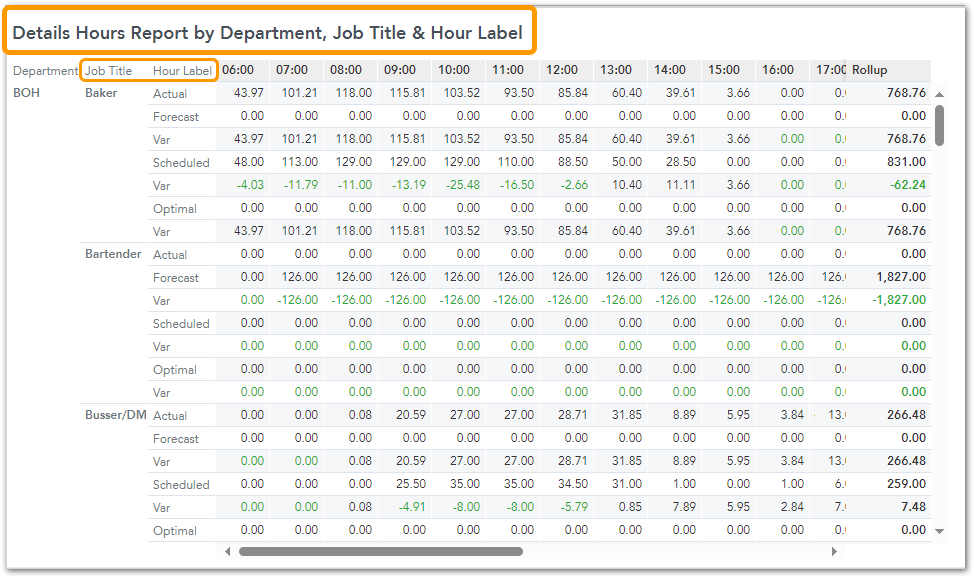The 'Details Hours' report is similar to the 'Labor Card' in HotSchedules, but with breakdowns by Job Role and Time Slot Hour labels. It provides departments with a more refined view of labor utilization and variances, helping them to optimize staff scheduling and operational efficiency.