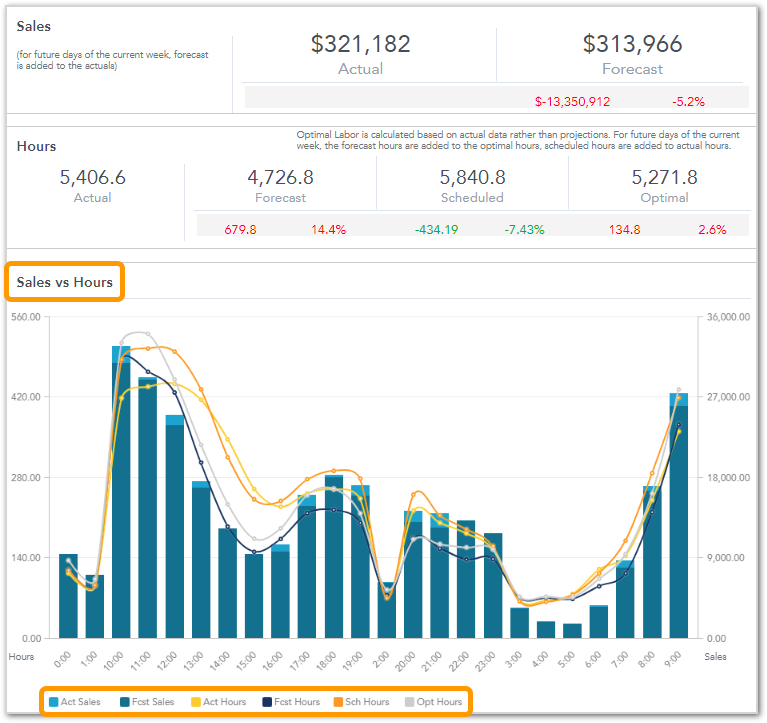 The chart shown below shows Sales vs Hours data, with the different types (Actual and Forecast Sales, Hours, etc) indicated at the bottom.