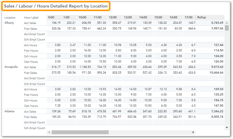 This report (see below) provides a detailed breakdown by location for Sales, Labor, and Hours across various time slots. Businesses can assess efficiency by comparing actual performance against forecasts, highlighting discrepancies in sales and labor usage across locations and times. This helps identify areas where staffing may need adjustment to better align with business demand.