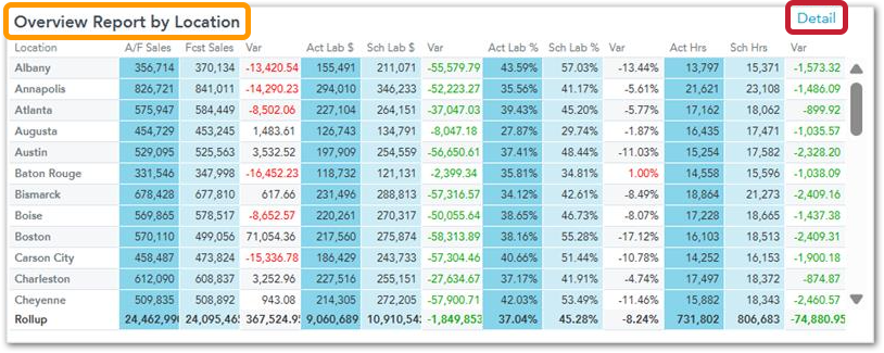 Some reports in the Labor dashboard in the North American offering of Fourth Analytics have a 'Detail' option that expands the displayed data, providing in-depth insights via a more detailed breakdown.