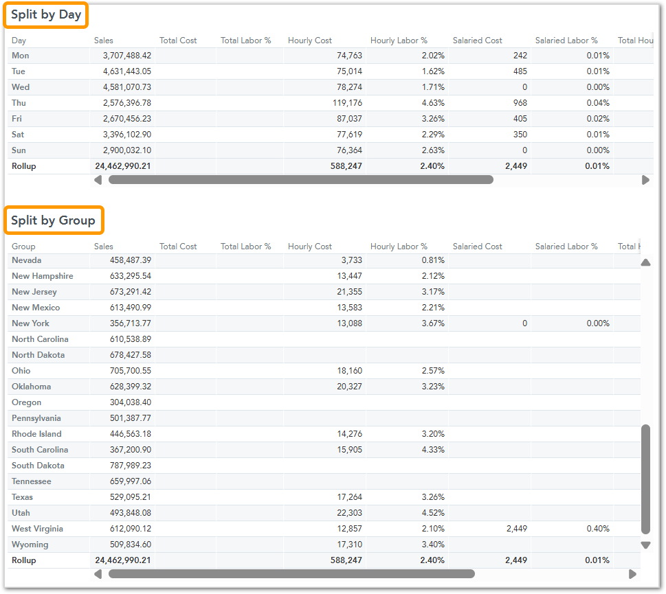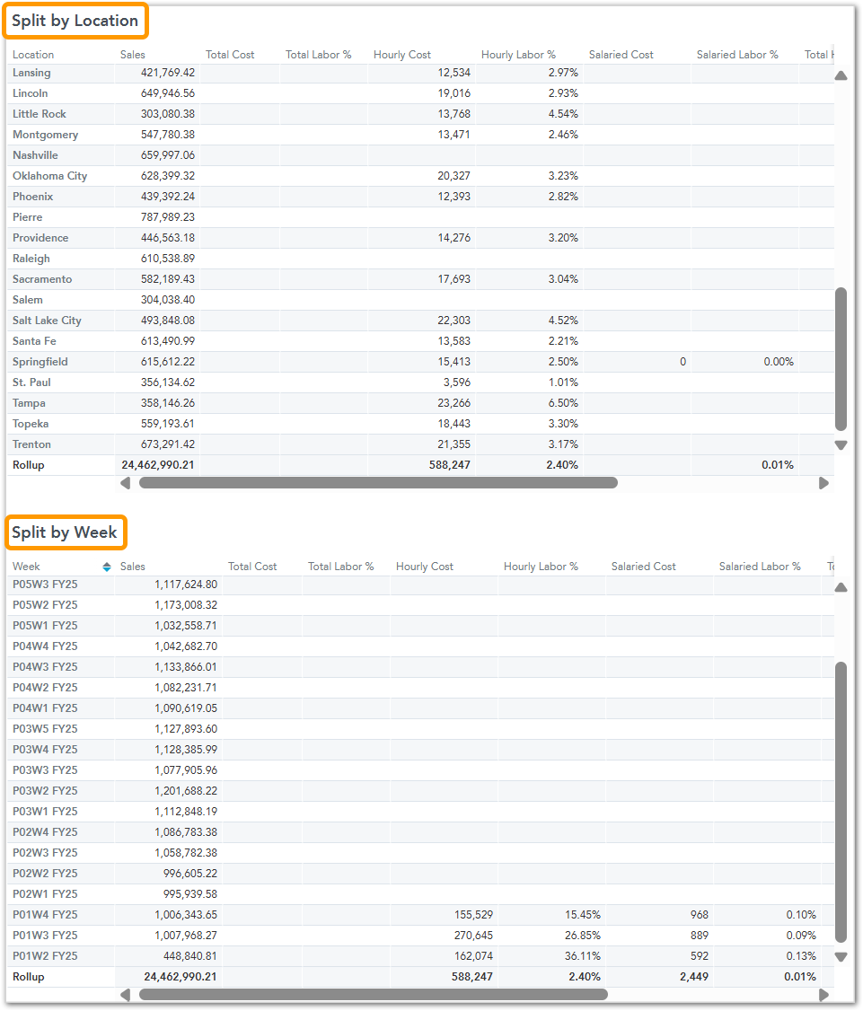 - Labor Cost: Displays total costs, broken down into Hourly, Salaried, and Other categories.