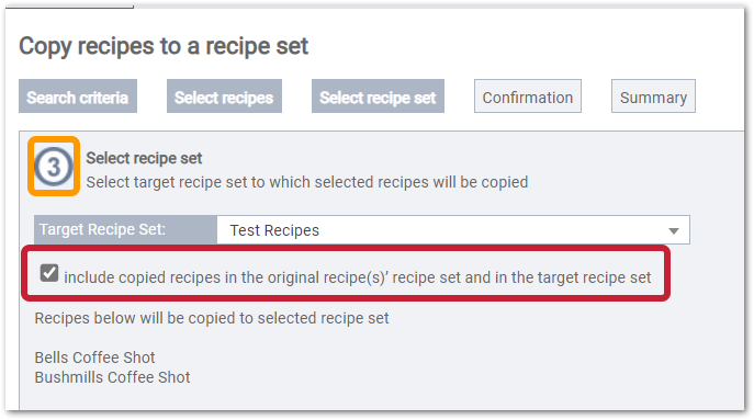 Fig. 4 - When 'set type' is not enabled, a new tick box is displayed on step 3 to include copied recipes in original recipes' recipe set
