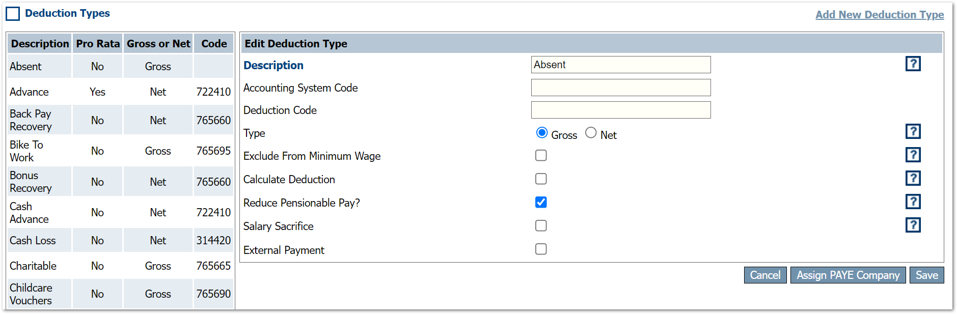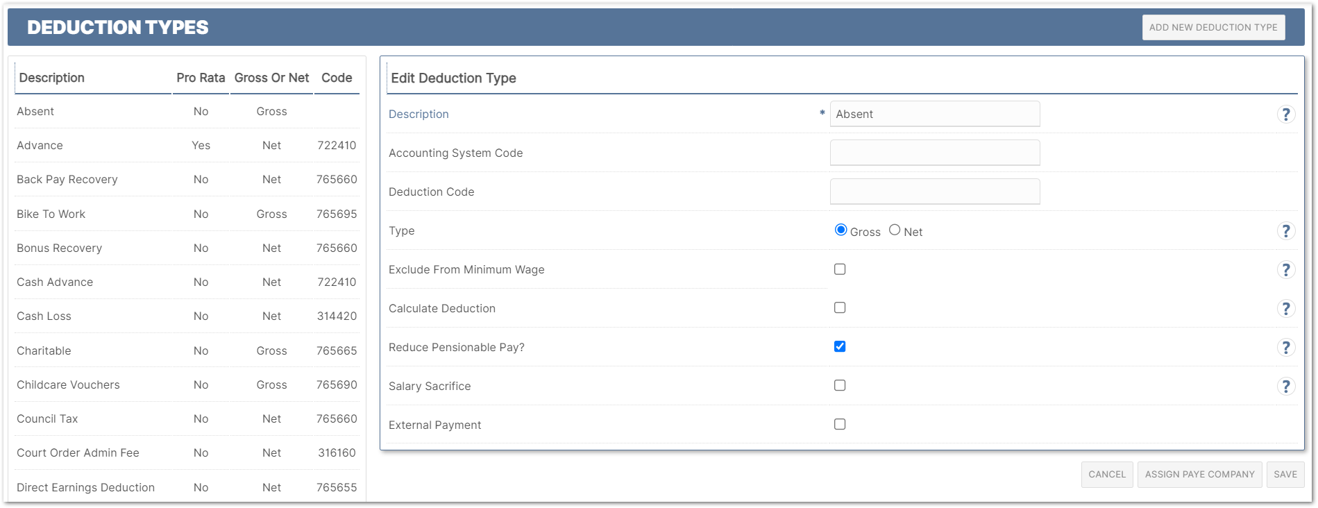 - To access the Deduction Types page, go to Payroll > Administration > Deduction Types