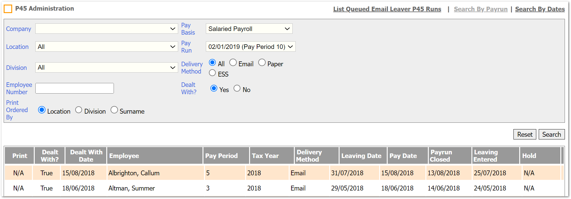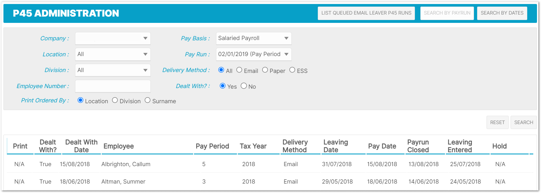 - To access the P45 Administration page, go to Payroll > HMRC Data Exchange > P45 Administration > Search by Payrun