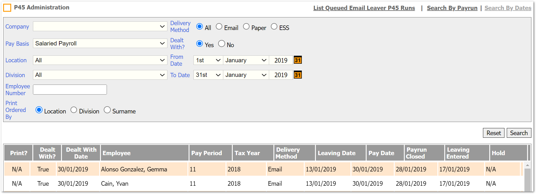 - To access the P45 Administration page, go to Payroll > HMRC Data Exchange > P45 Administration > Search by Dates