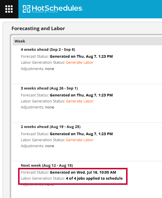 If no adjustment are applied and they are using our Labor Optimization, then it will lock when they generate labor for at least one job for the given week. Managers will know it's locked because the forecast for that week will show the timestamp of its last update e.g. Generated on Tue, Jun 17, 2:40 PM.