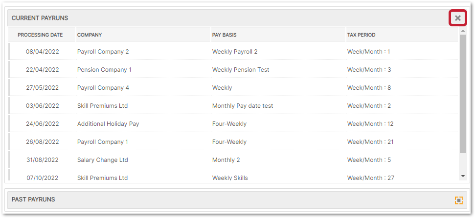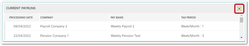 - To see more of the Current or Past Payruns listed, use the expand icon in the top-right corner