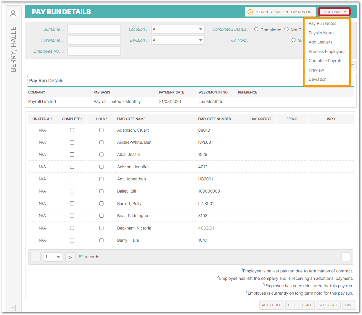 Within the current Pay run, all page links can be found within the Page Links menu item in the top-right corner.