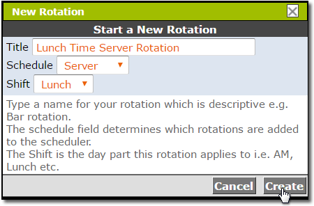 - This will open a menu where you can input the name, schedule, and shift for your custom rotation. To save your new customer rotation, click Create.