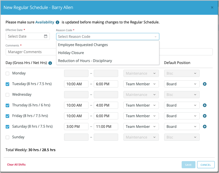 A reason Code is now required when creating a new Regular Schedule or Good Faith Estimate for all employees at any stores utilizing these fair workweek scheduling options.