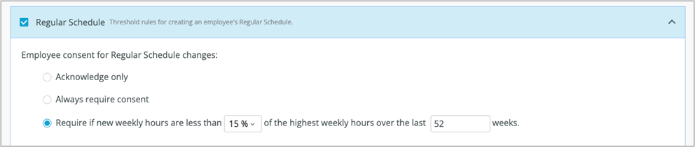 Previously there were two Regular Schedule consent options, Acknowledge Only, and Always require consent. This new option gives clients the ability to define an acceptable threshold for the reduction of hours over a range of time as outlined in the New York City Fair Work Week ordinance.