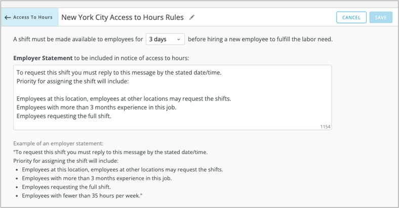 Many Fair Work Week ordinances require that hours be made available to existing employees at nearby locations before a new employee can be hired. Companies now have the ability to define Access to Hours Groups in which all employees at the applicable stores will be sent an HS Message with details for each shift when a store is considering hiring a new employee to ensure compliance with local ordinances.