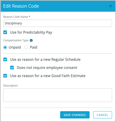 In the ASC, Scheduling > Reason Codes has been updated to allow reason codes to be configured for Predictability Pay (includes other Pay Exceptions such as minimum time and split shift), Regular Schedules, and/or Good Faith Estimates. All previously existing reason codes were automatically configured as Use for Predictability Pay.