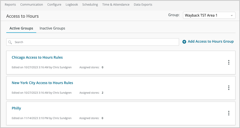 Access to Hours is configured in the ASC under Configure > Access to Hours. After selecting a Group in the top right, use the Add option to create a group, then use the Assign menu option to add stores to this group. You only need to assign stores to groups based on their geographic location. For example, stores in NYC can be assigned to an Access to Hours group and stores in Philadelphia can be assigned to a different Access to Hours group.