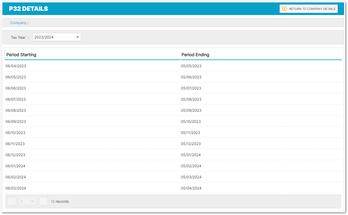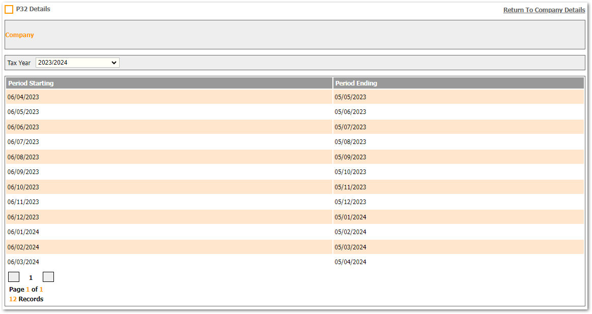- To access the View P32 Details page, go to Payroll > Administration > Company Setup > select Company > Page Links > View P32 Details > select Tax Month