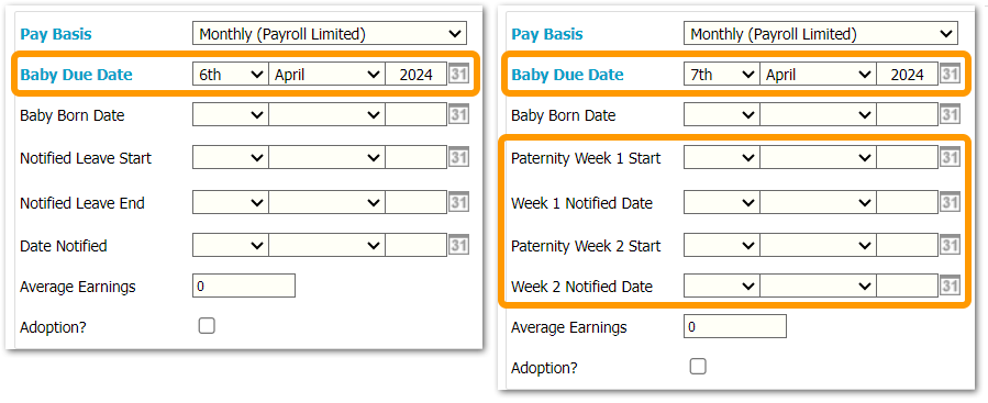 - If the due date is 6th April 2024 or earlier, with Adoption? not ticked, then the Paternity Leave record will be created in the existing, original way, where the two weeks are taken all in one go.