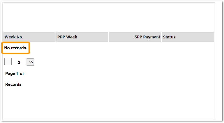 - This will take the user to the Paternity Pay Records page where normally the pay schedule would generate and be shown, but instead will show as blank. This is because Week 1 and/or Week 2 of paternity has not yet been booked: