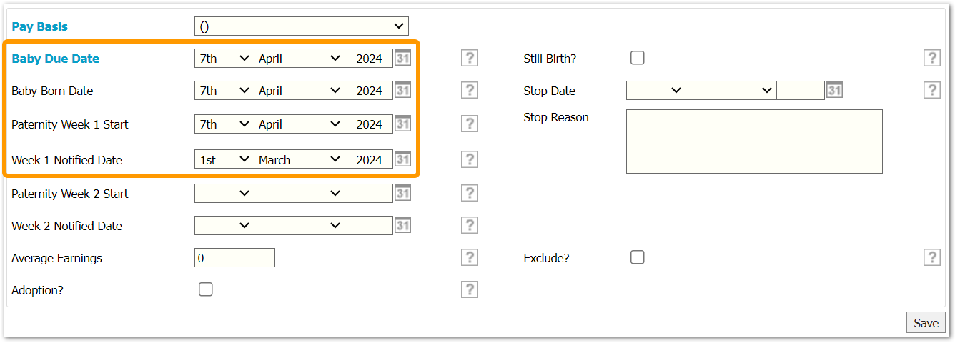 - When the baby is born (giving the father the right to now take paternity leave), the Baby Born Date can be entered, as well as the Paternity Week 1 Start and Week 1 Notified Date