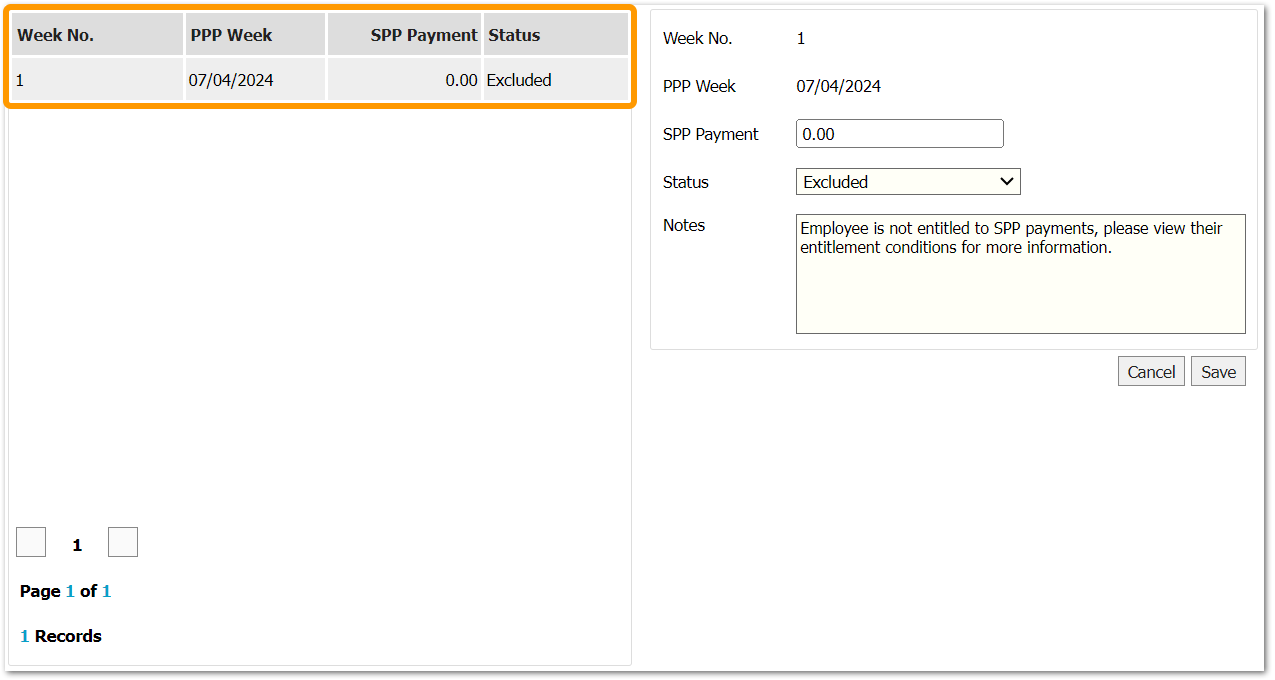 - The ability to update the exclusion status or add notes after selecting an SPP payment record is unchanged and operates as before. Where it states, in this example, to view entitlement conditions for more information, the user can still select View Entitlement at the very top of this page as this is also unchanged and operates as before