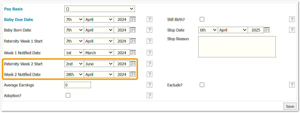 Once a Baby Born Date has been added, but Paternity Week 2 Start has not, the Stop Date will update to 52 weeks from the Baby Born Date to show the last possible date Paternity Leave can be booked for.