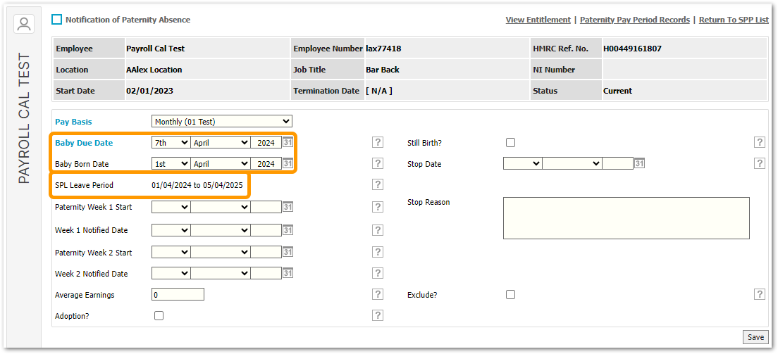Fig.6 - Paternity Pay Record with new SPL Leave Period