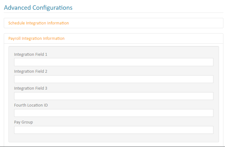 Payroll Integration Information The Fourth Location ID and Pay Group fields have been added to the Payroll Integration Information Tab. |