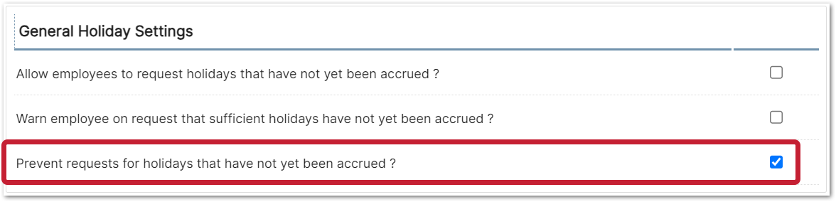 Before this release, if a job title had the Prevent requests for holidays that have not yet been accrued? setting enabled, then upon requesting holiday, if an employee had not accrued enough time for the request then it would not be authorised, regardless of how much carried-over holiday they had.