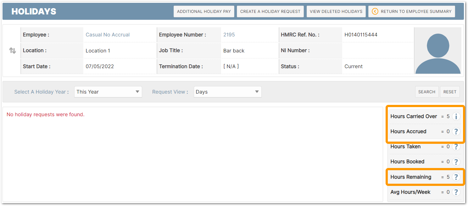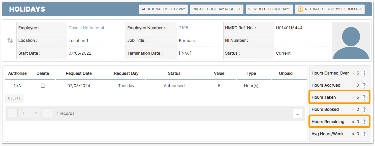 In the example below (Fig.2) an employee's 'Accrued' value is 0 and their 'Carried Over' value is 5. So, their 'Hours Remaining' value is also 5.